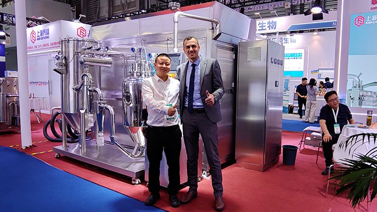 ①.低温喷雾干燥功能对比冻干机效率提升10倍左右,单位产量节省能耗20倍左右,适用于热敏性物料(温度低至35℃)如:蛋白类、菌类、多肽等发酵后的溶液